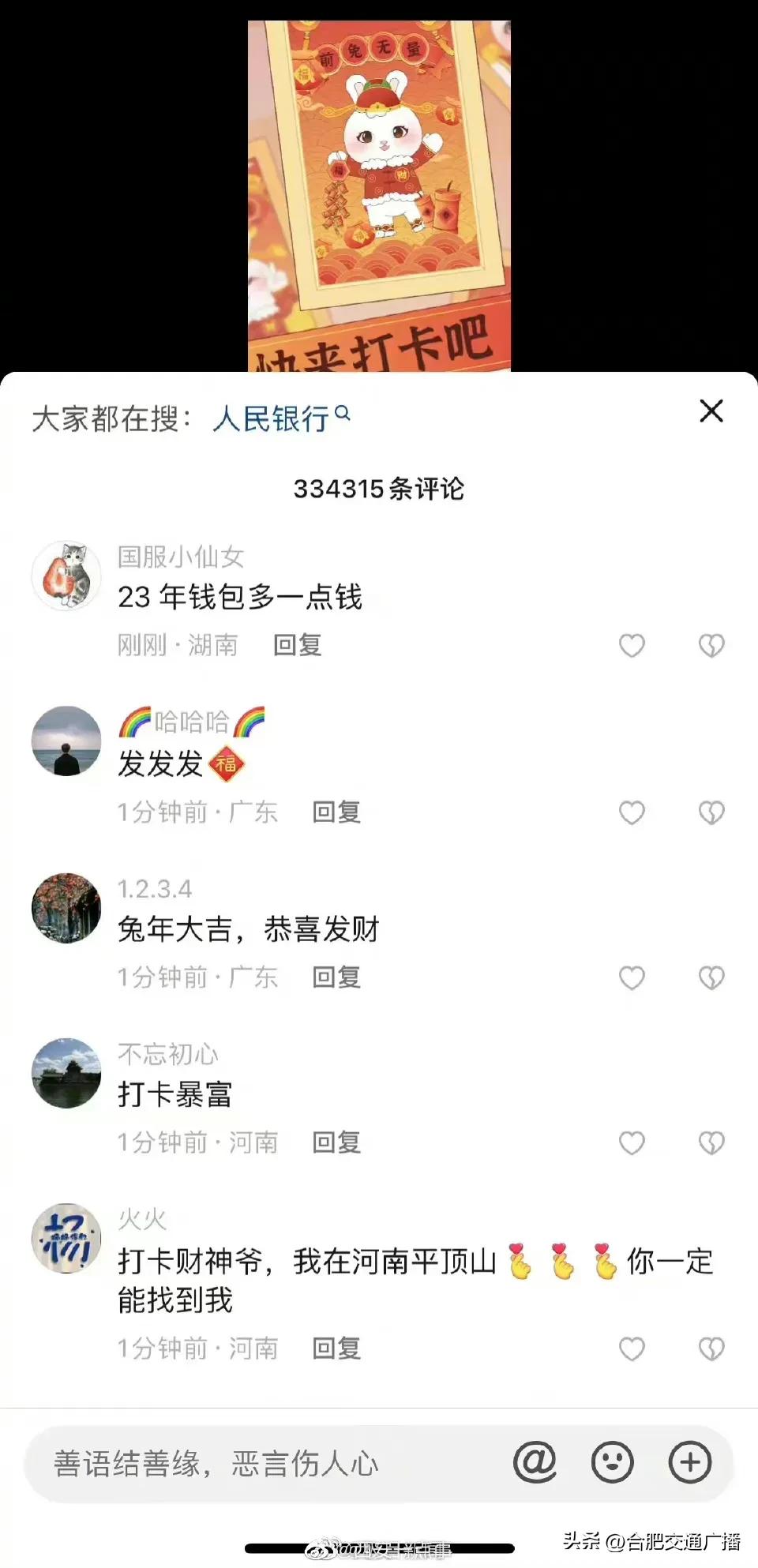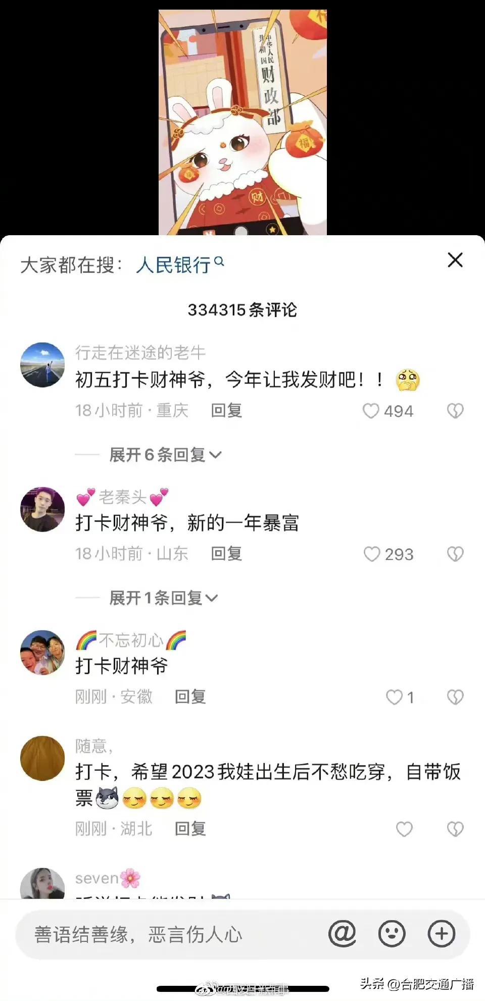 大年初五财政部账号成网友打卡地(网友纷纷给“真财神爷”花式留言) 2023-01-26 热点新闻 6137 作者:网友投稿 今天(1月26日)正月初五,是很多地方“迎财神”的日子。财政部在今天发了一条“都来打卡财政部”的动画短视频,引来网友们的点赞和转发,祈求新年“财运亨通”。